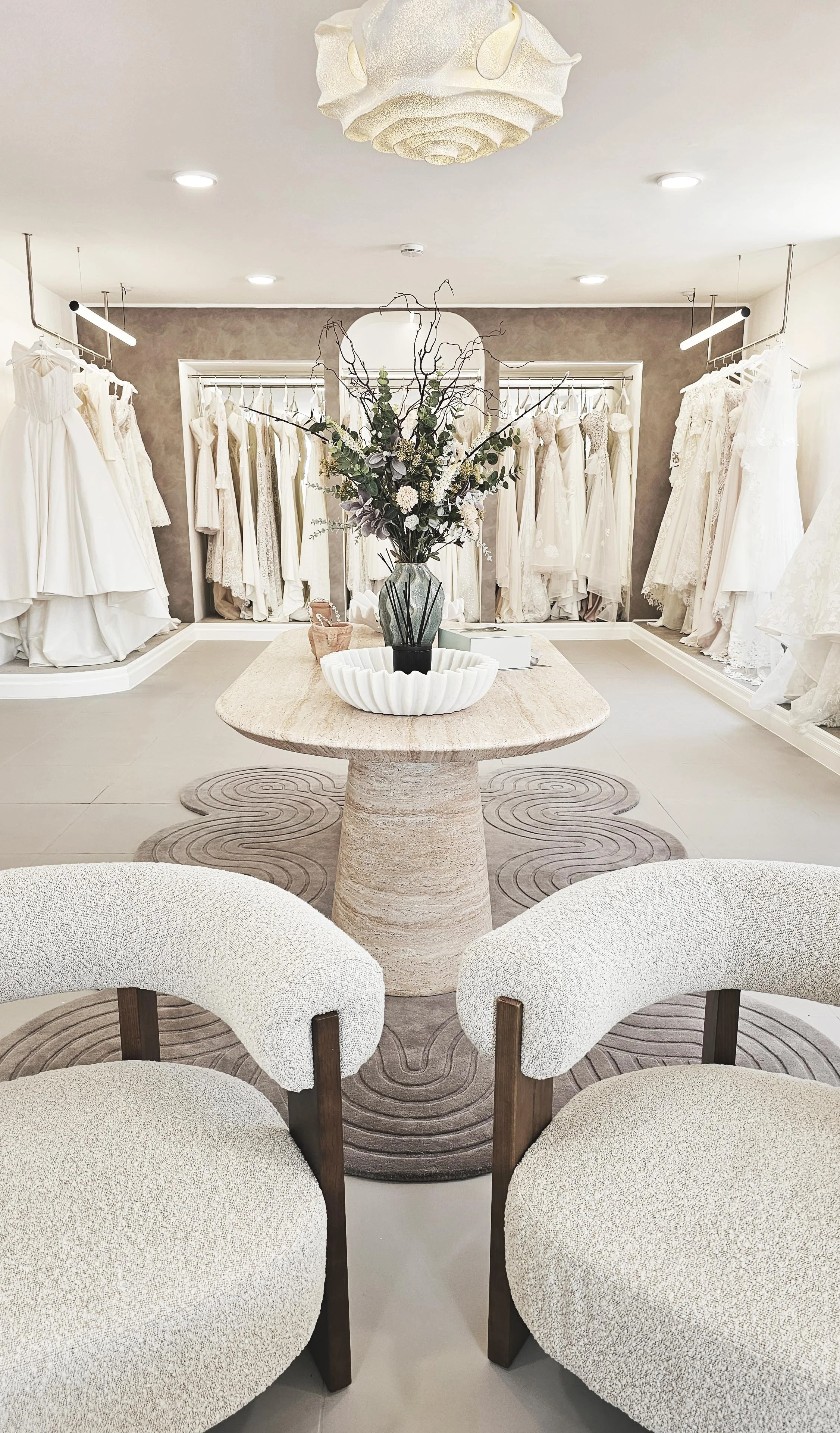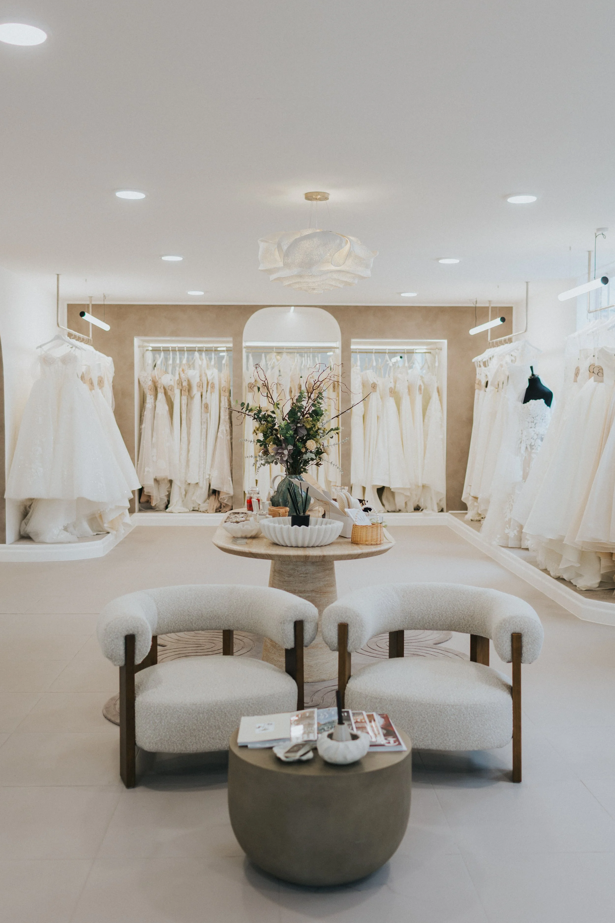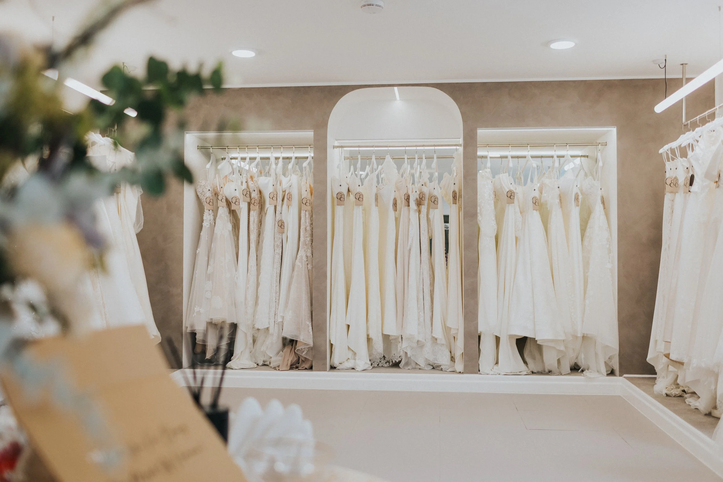 From the moment you walk in, you’ll feel the difference. Our space is designed with room to breathe, so you won’t be faced with rails crammed full of gowns. Instead, we give each dress its own moment, beautifully displayed and cared for, so you can take in the details, see what you’re drawn to, and browse at your own pace.