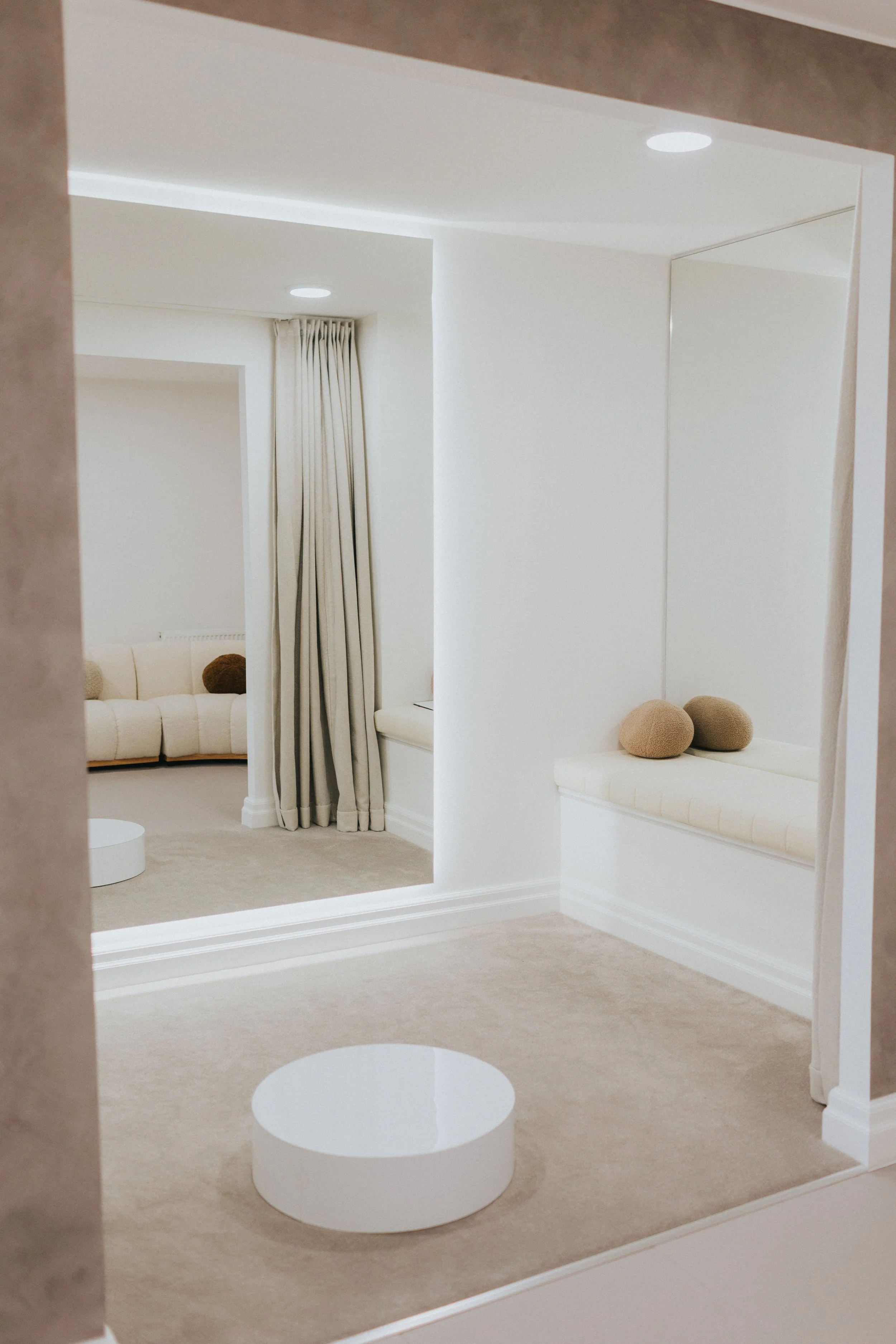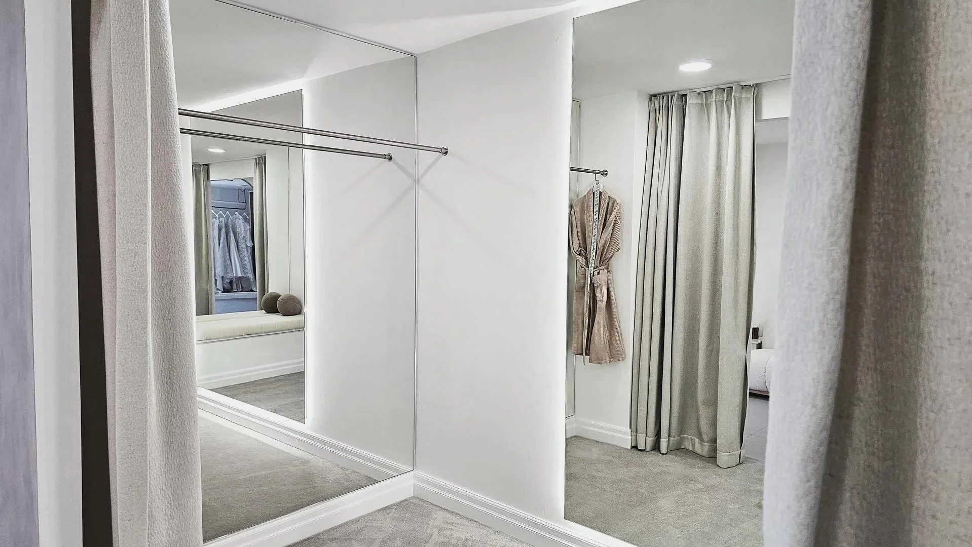 With spacious, beautifully lit changing areas, you will have room to breathe and take in every detail as you reveal each look in front of our statement mirrors and elegant shelf downlighting, that only enhances the ambiance. Inside the changing suite, you will find built-in bench seating, a plush robe, and cosy slippers — thoughtfully included to make your try-on experience even more comfortable and effortless. Perfect for slipping in and out of wedding dresses as you explore a range of beautiful options. Bring up to seven guests, who can relax on our comfy sofa seating and soak in this special moment right alongside you.