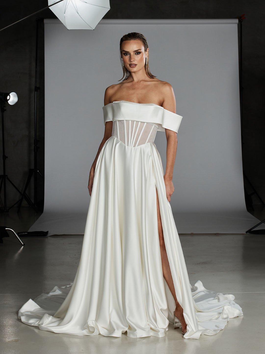 Our Orson wedding dress is designed for the cool-girl minimalist bride who still wants a look that feels distinctly bridal for her wedding. Crafted in lightweight stretch satin, she drapes fluidly, combining structure with soft movement. Her off-shoulder Bardot neckline adds relaxed formality, offering subtle coverage while keeping the silhouette modern. A sheer illusion bodice with boning draws in the waist and contours the torso. The Basque waist flows into a softly pleated A-line skirt, detailed with a leg split for movement and elegant allure. Brides will love her hidden side seam pockets and delicate row of buttons trailing down the back.