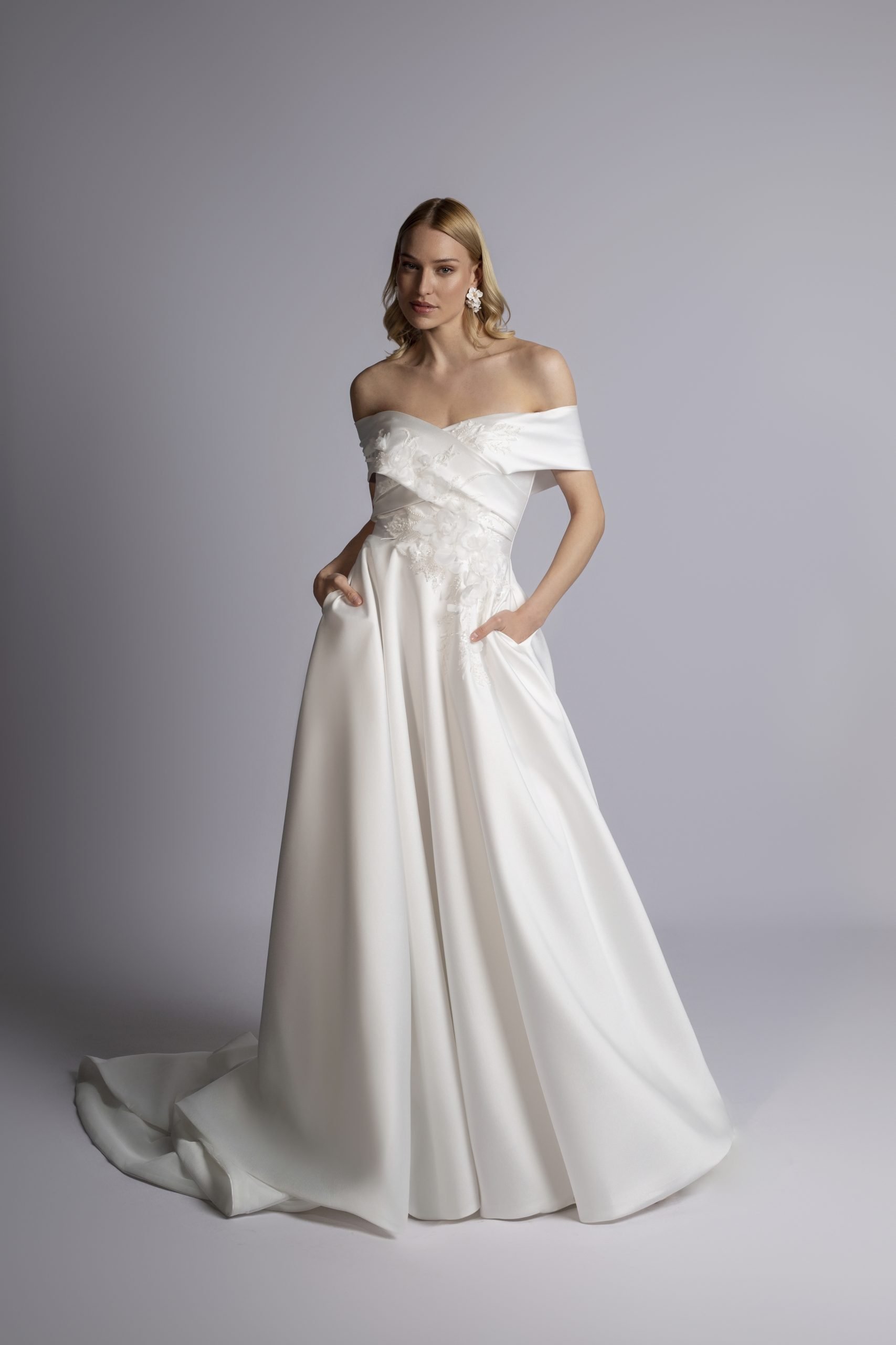 Aubree is effortlessly elegant, with a timeless silhouette and the prettiest touch of texture. Her pleated Bardot neckline drapes softly off the shoulders, framing the collarbone and creating a beautifully flattering shape through the bodice. From the defined waist, the skirt falls into a full, sweeping silhouette that feels light, clean, and made for movement. Soft 3D floral detailing and delicate beaded motifs bloom across the front, adding subtle romance without taking away from her modern, minimalist feel.