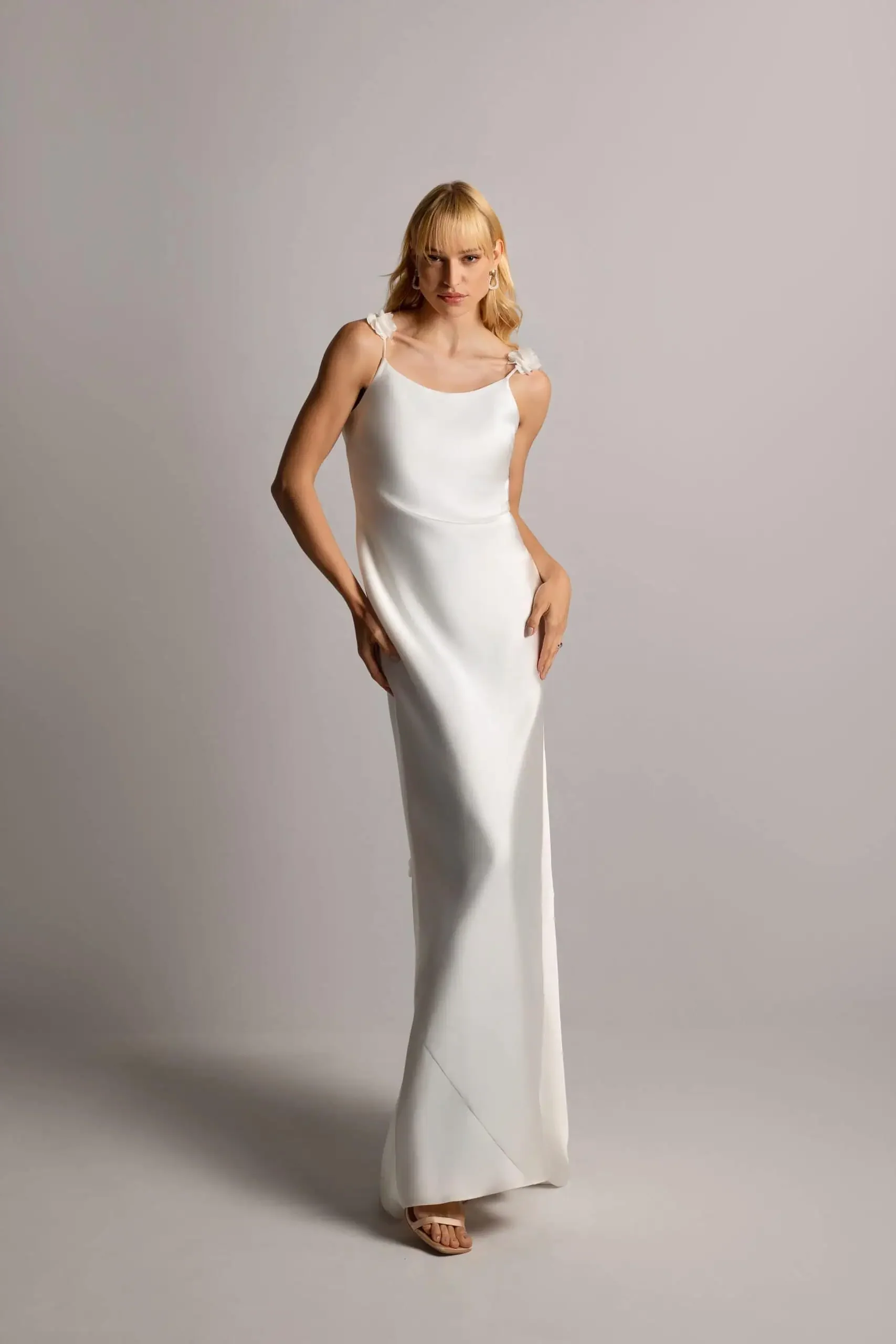 Dani is the ultimate effortless slip dress, made for brides who love clean lines and a quiet kind of luxury. Crafted in smooth, slipper satin, she skims the body with a fluid, minimalist silhouette that feels modern, comfortable, and beautifully unfussy. A soft scoop neckline and delicate straps keep the look light and easy, while the sleek straight skirt creates a long, elegant line from every angle. Simple, chic, and timeless, Dani is perfect for understated ceremonies, city weddings, or a second-look moment that still feels unmistakably bridal.