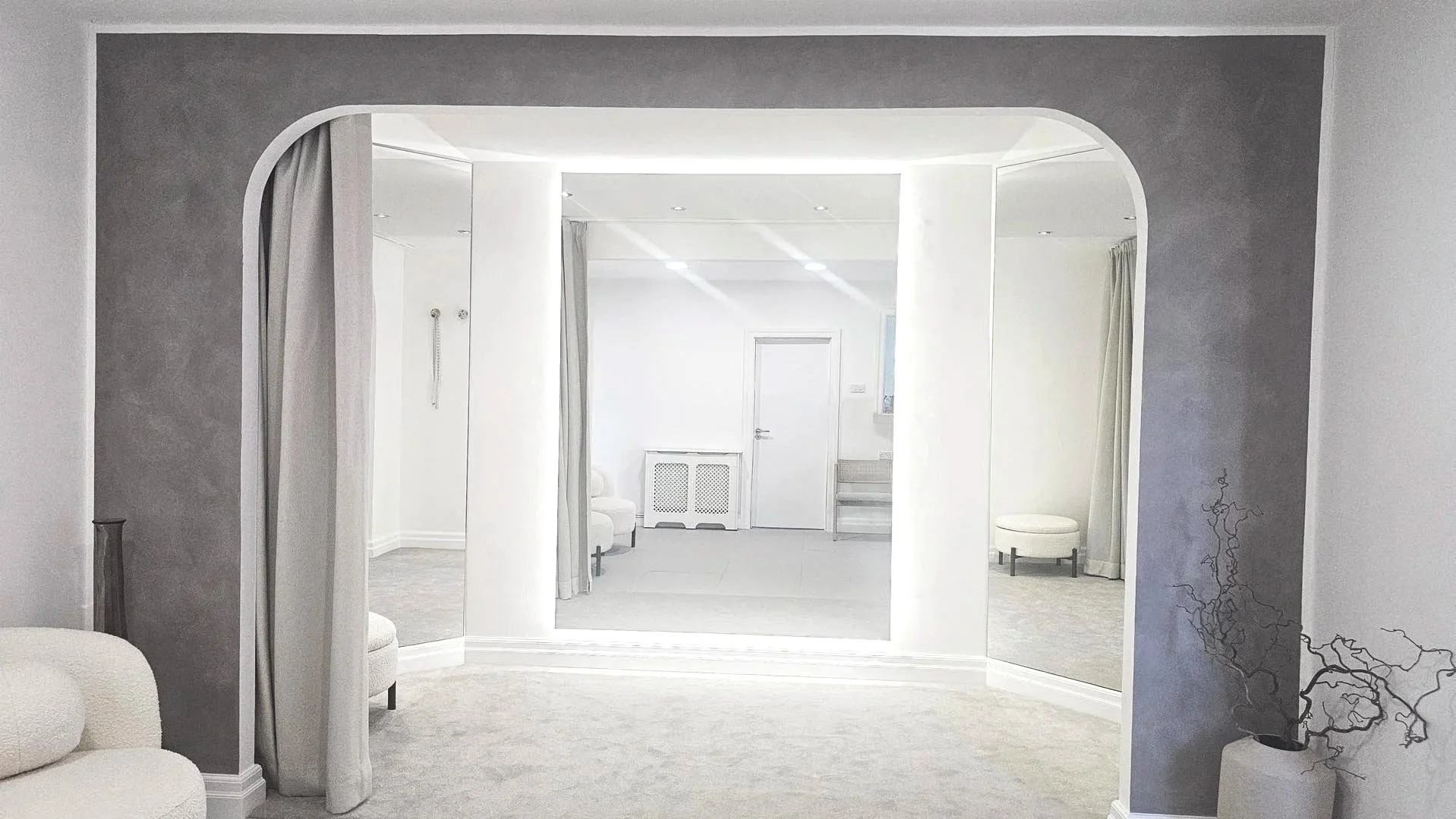While we offer a beautifully appointed space dedicated for brides to try on wedding dresses, our dedicated fitting suite, designed specifically for bridal dress alterations and bespoke fittings, continues the experience and upholds the same high level of elegance with even more function. Thoughtfully created with precision in mind, the suite features a stunning, backlit central mirror flanked by two 45-degree angled side mirrors, allowing you to view every detail and silhouette from all angles. Here, nothing is overlooked.